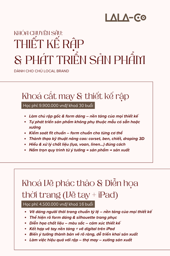 Chương trình học tại LALA được xây dựng theo hướng thực hành – hiểu bản chất – phát triển tư duy thiết kế, giúp học viên không chỉ biết may mà còn hiểu cách tạo ra một sản phẩm thời trang hoàn chỉnh.